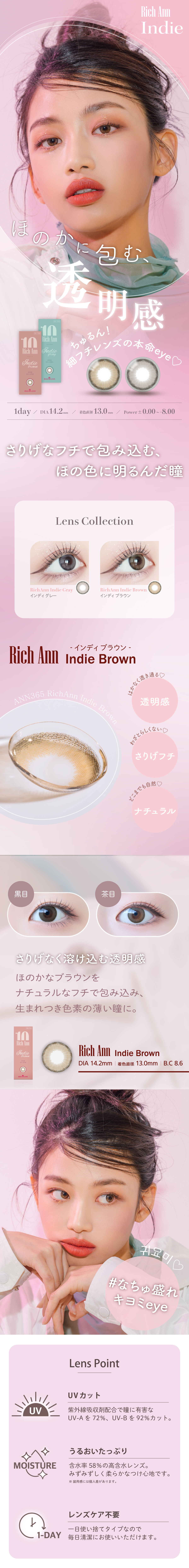 ほのかなブラウンをナチュラルなフチで包み込んだカラーが作り出す、生まれつき色素の薄い瞳に。