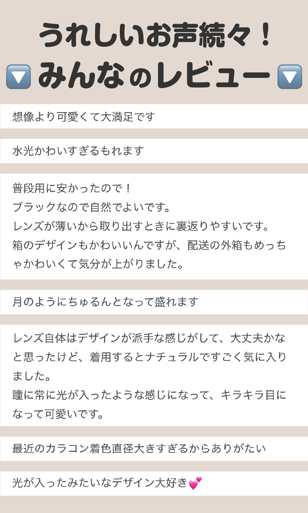 初めてこのショップで買いました!カラコンが梱包されている箱が可愛かったです!文化祭用で買ったんですけど、思ったよりも黒かったです。ディープブラウンが思ったより茶色というレビューを見て、ソフトブラックの方がいいかなと思って買ったんですけど、黒目が少し大きくなった?ぐらいでした。友達もカラコンつけてるのわかってませんでした笑ディープブラウンの方がよかったかなって思ってます笑あと水光カラコン?だったと思うんですけど、色がついている部分がめっちゃ回るので気になる人はこまめに確認した方が良さそうです!2人中、2人の方が、このレビューは参考になったと投票しています。